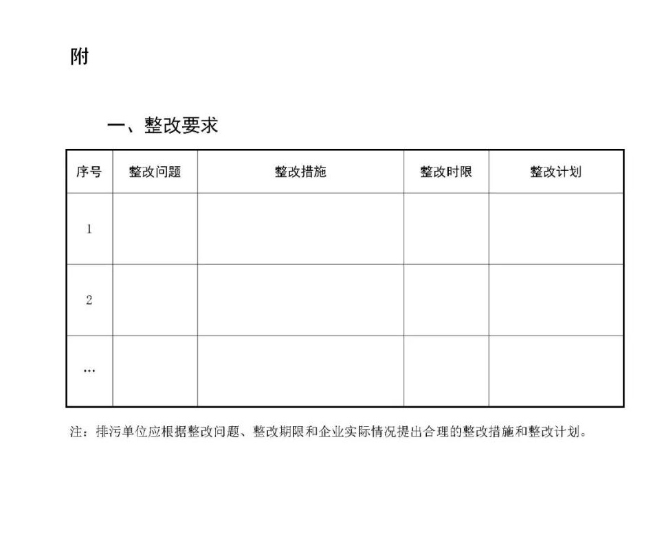 (二)附件。內容包括排污限期整改要求,列明整改問題、整改內容、整改時限等,提出整改期限內污染物排放要求,列明各排污口污染物排放法定執行標準限值和自行監測要求等。