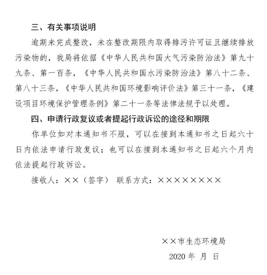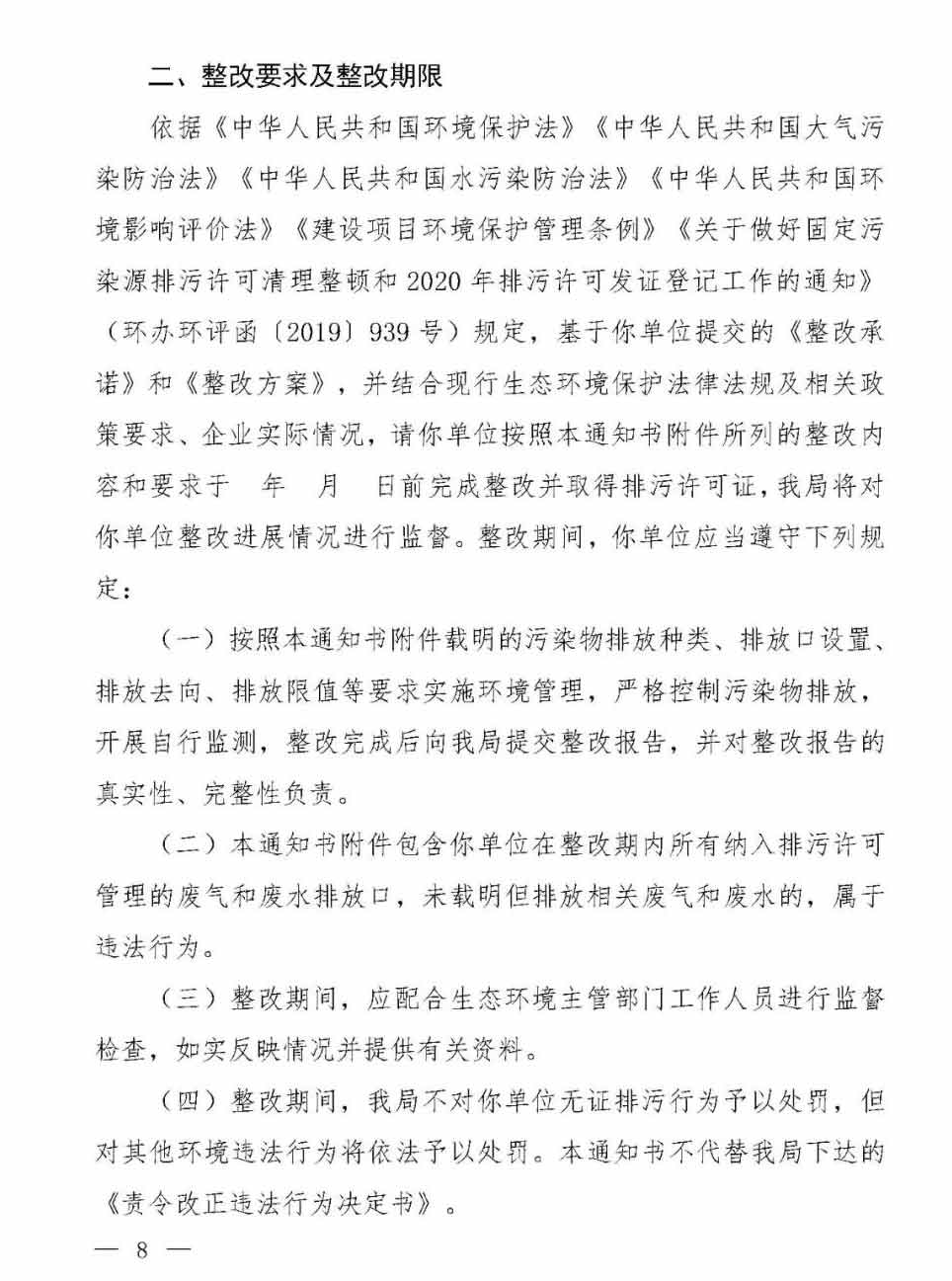 ?。ǘ┫逻_。對于申請材料和整改方案齊全且符合要求的,生態環境主管部門應當自受理申請之日起十個工作日內下達整改通知書,明確整改內容、整改期限,提出整改期間環境管理要求,告知相應法律責任和救濟權利等。