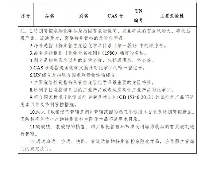 對列入《特別管控危險化學(xué)品目錄(第一版)》的危險化學(xué)品應(yīng)針對其產(chǎn)生安全風(fēng)險的主要環(huán)節(jié),在法律法規(guī)和經(jīng)濟技術(shù)可行的條件下,研究推進(jìn)實施以下管控措施,最大限度降低安全風(fēng)險,有效防范遏制重特大事故。