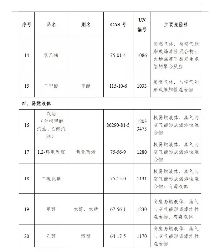 《目錄》列舉的特別管控危險化學(xué)品包括20類,分別是:硝酸銨[(鈍化)改性硝酸銨除外]、硝化纖維素(包括屬于易燃固體的硝化纖維素)、氯酸鉀、氯酸鈉、氯、氨、異氰酸甲酯、硫酸二甲酯、氰化鈉、氰化鉀、液化石油氣、液化天然氣、環(huán)氧乙烷、氯乙烯、二甲醚、汽油(包括甲醇汽油、乙醇汽油)、1,2-環(huán)氧丙烷、二硫化碳、甲醇、乙醇。
